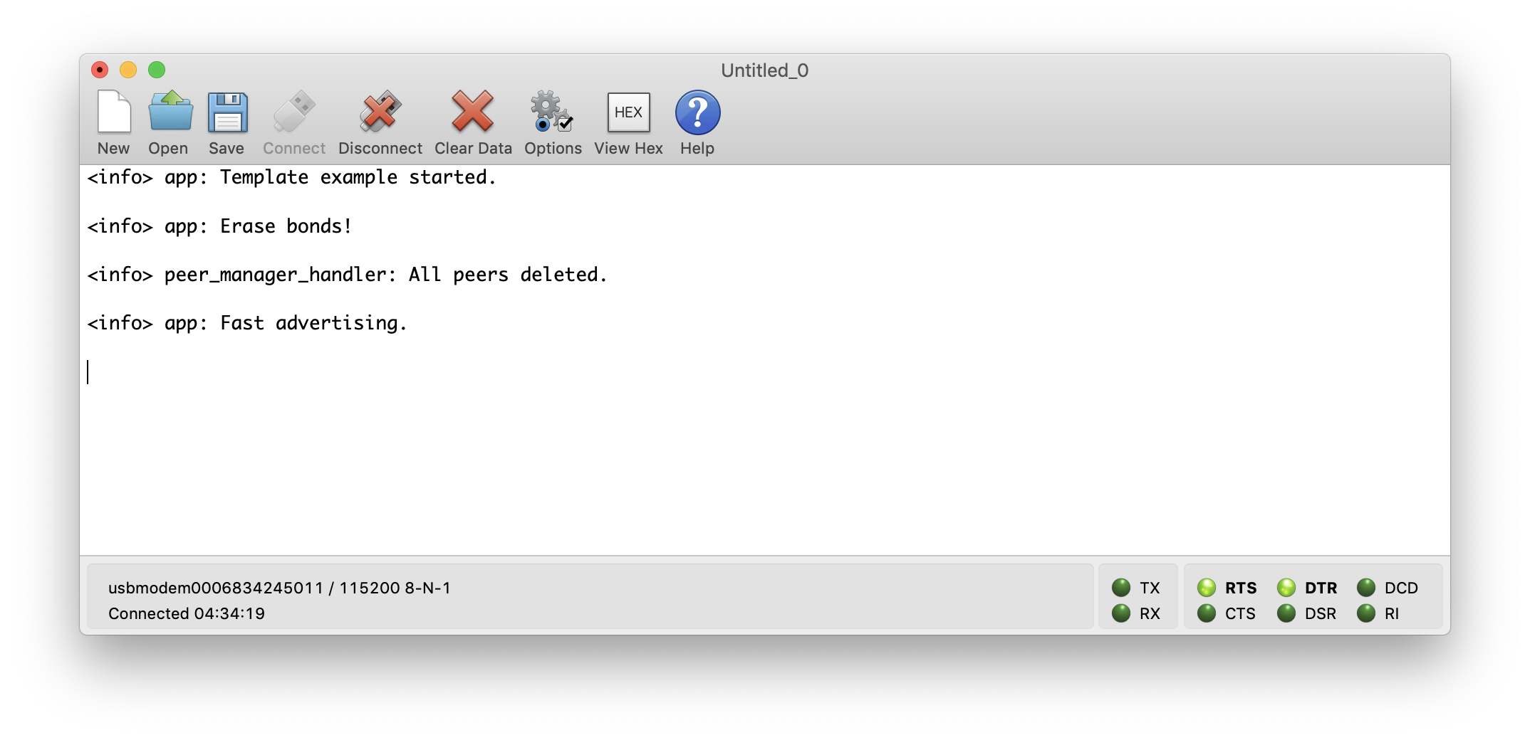 Even though we verified that our application is running correctly and no errors show up in the terminal window, we still need to verify its BLE functionality. The easiest way to do so is by running a BLE Central mobile app such as nRF Connect (iOS or Android) or LightBlue (iOS or Android).