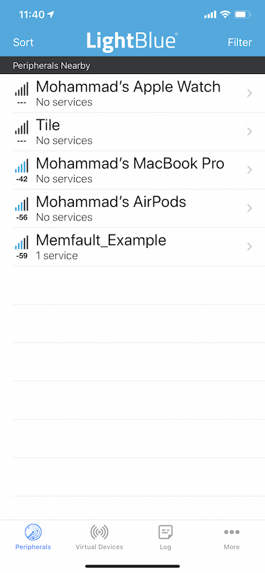 Once you launch LightBlue, you’ll be presented with a screen showing all the BLE devices advertising in the vicinity. Make sure you have Bluetooth enabled on your phone first.