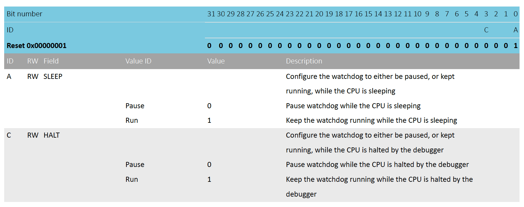 By default, the watchdog will be active counting down the down-counter while the CPU is sleeping and when it is halted by the debugger. It is however possible to configure the watchdog to automatically pause while the CPU is sleeping as well as when it is halted by the debugger.