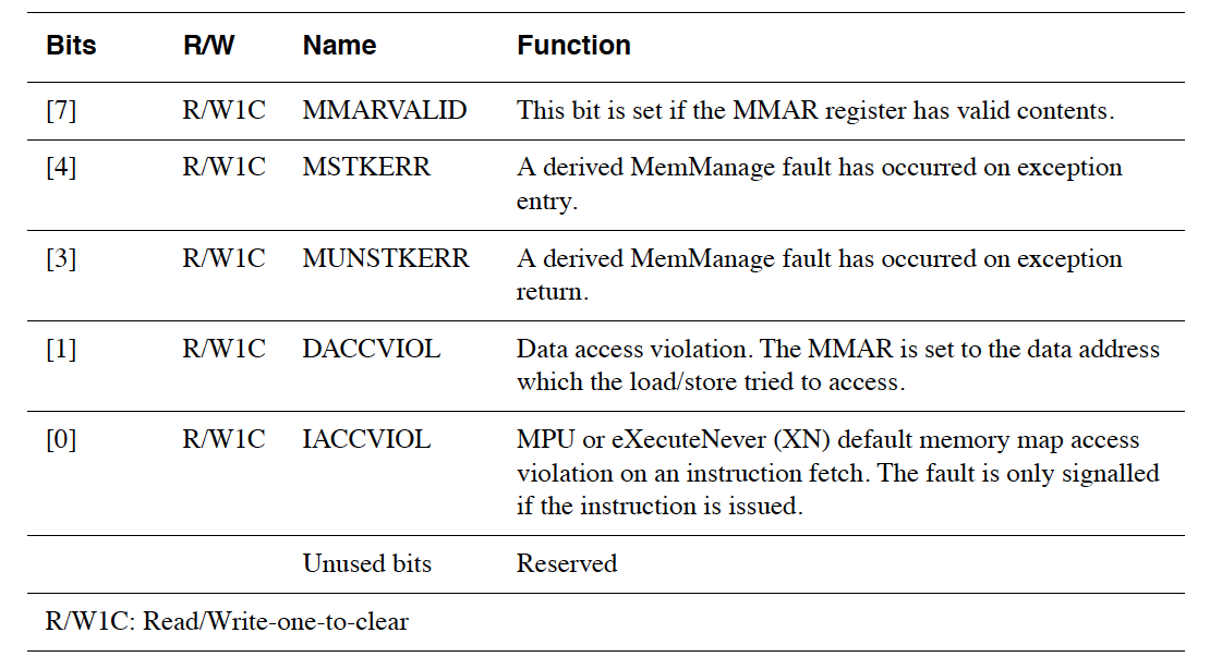 The first is the MemManage Status Register (MMFSR) - 0xE000ED28: