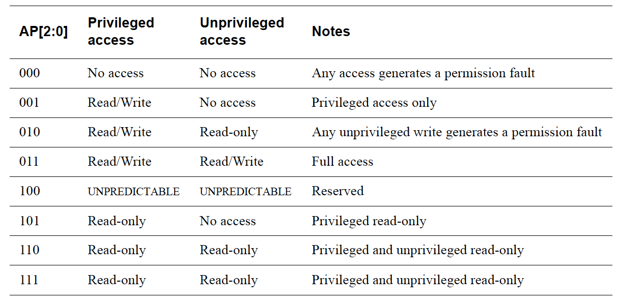 - disable all read & write accesses for privileged and/or unprivileged code.