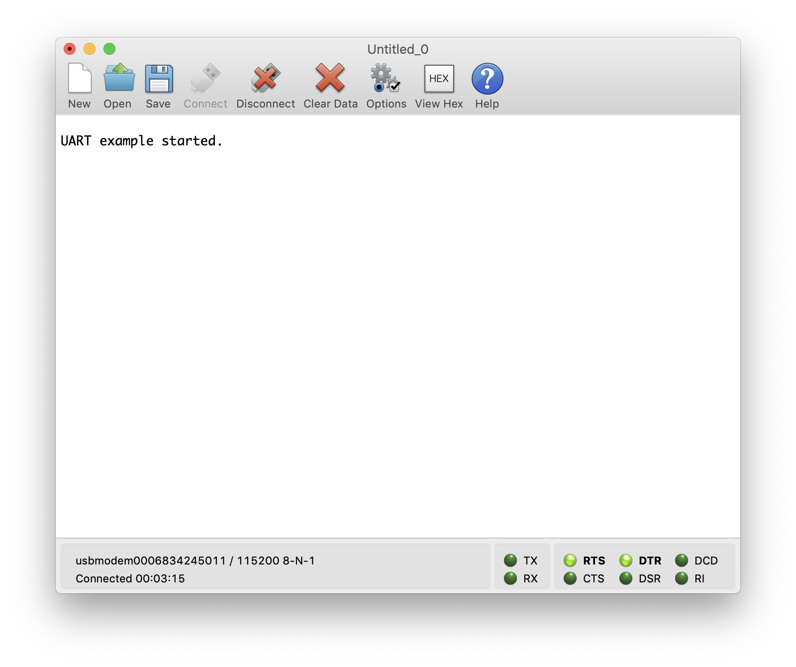You may not see any output since the program probably started before you connected. To reset the development board, we can simply run the following command from the Terminal: