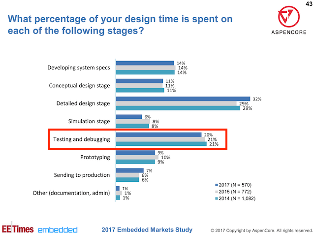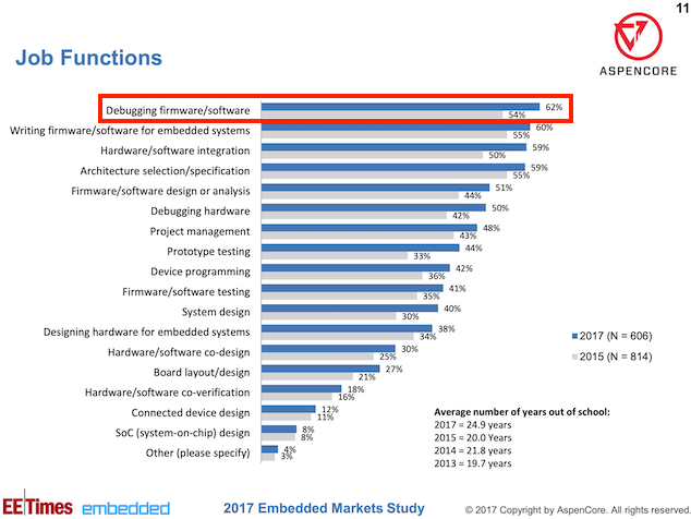I’ll leave you with a few figures taken from the 2017 Embedded/EETimes Embedded Markets Study survey which showcase the significance of debugging in the professional life of a firmware developer.