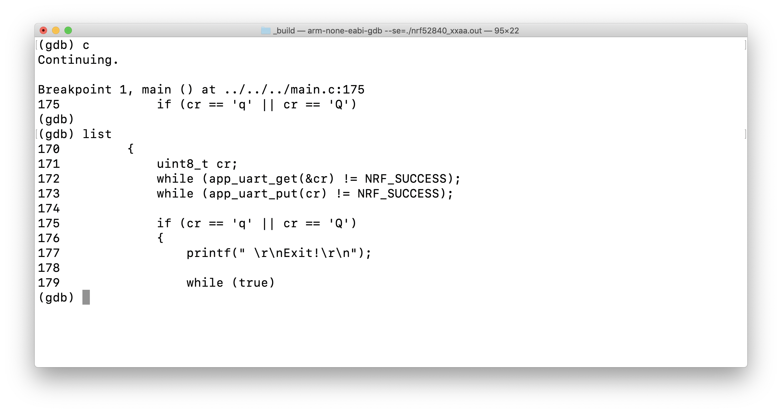 Notice that GDB stepped into the function app_uart_get() after reaching line 172.