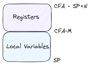 Alright, we’re almost done defining acronyms, I promise! You may have noticed CFA mentioned in all of our unwind rules defined in both the CIE and FDE. CFA stands for Canonical Frame Address and is probably the most important part of our unwind rules. It represents the base address of the frame we’re trying to reconstruct. Looking out our CIE again, you may recall this line: