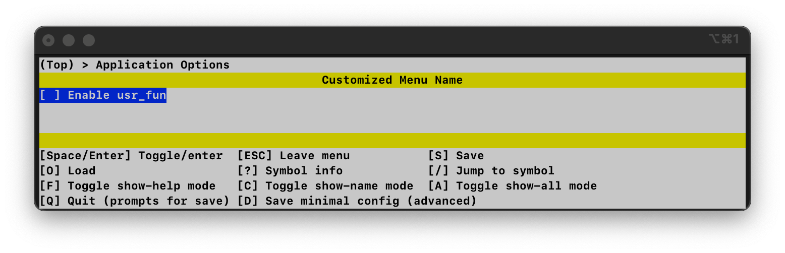 The new, custom main menu name “Customized Menu Name” is only visible in the interactive Kconfig tools, such as menuconfig, and is not used within the generated zephyr/.config file. The interactive tools now also show our newly created menu and symbol.