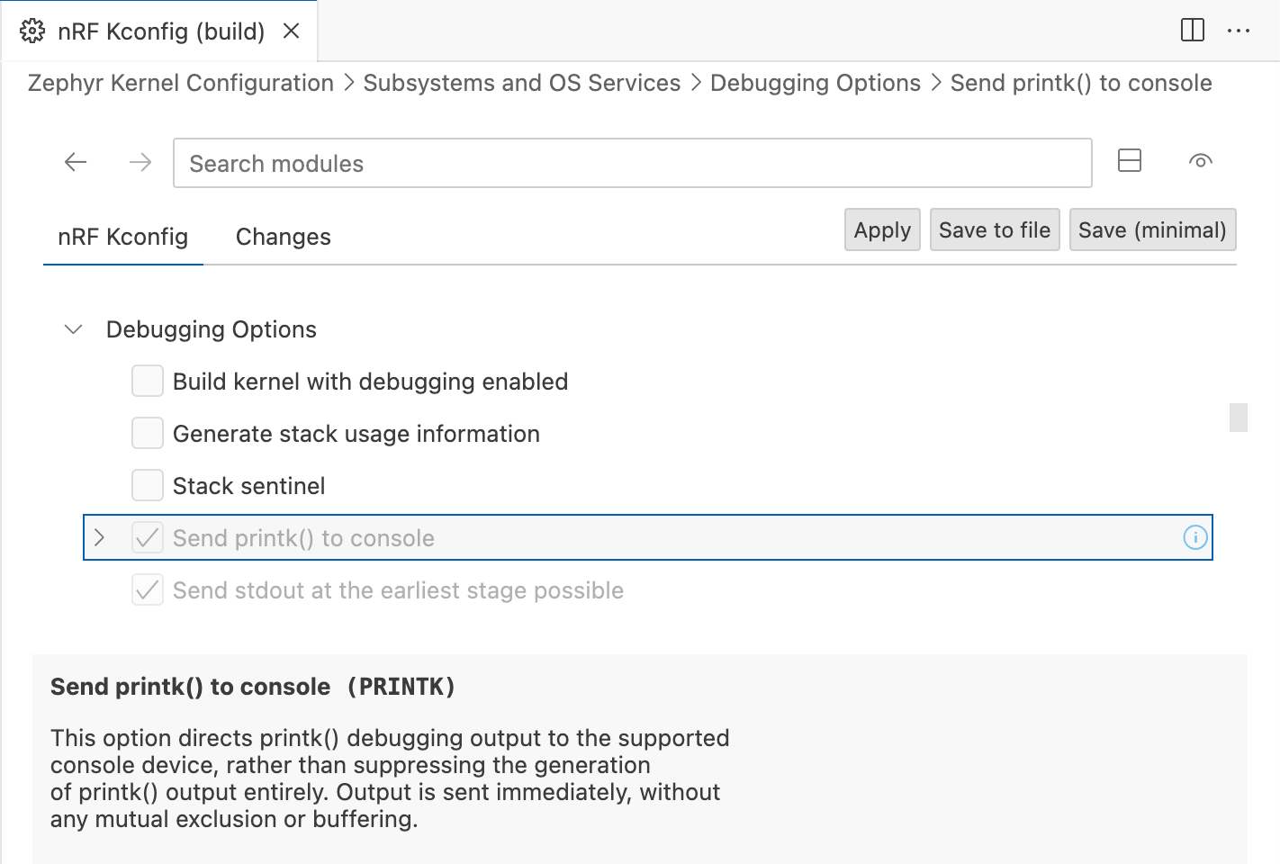 As you can see from the above Kconfig file, unless configured otherwise, PRINTK is enabled by default. We can configure symbols to our needs in the application configuration file prj.conf that we’ve encountered in the previous article. Symbols are assigned their values using the following syntax: