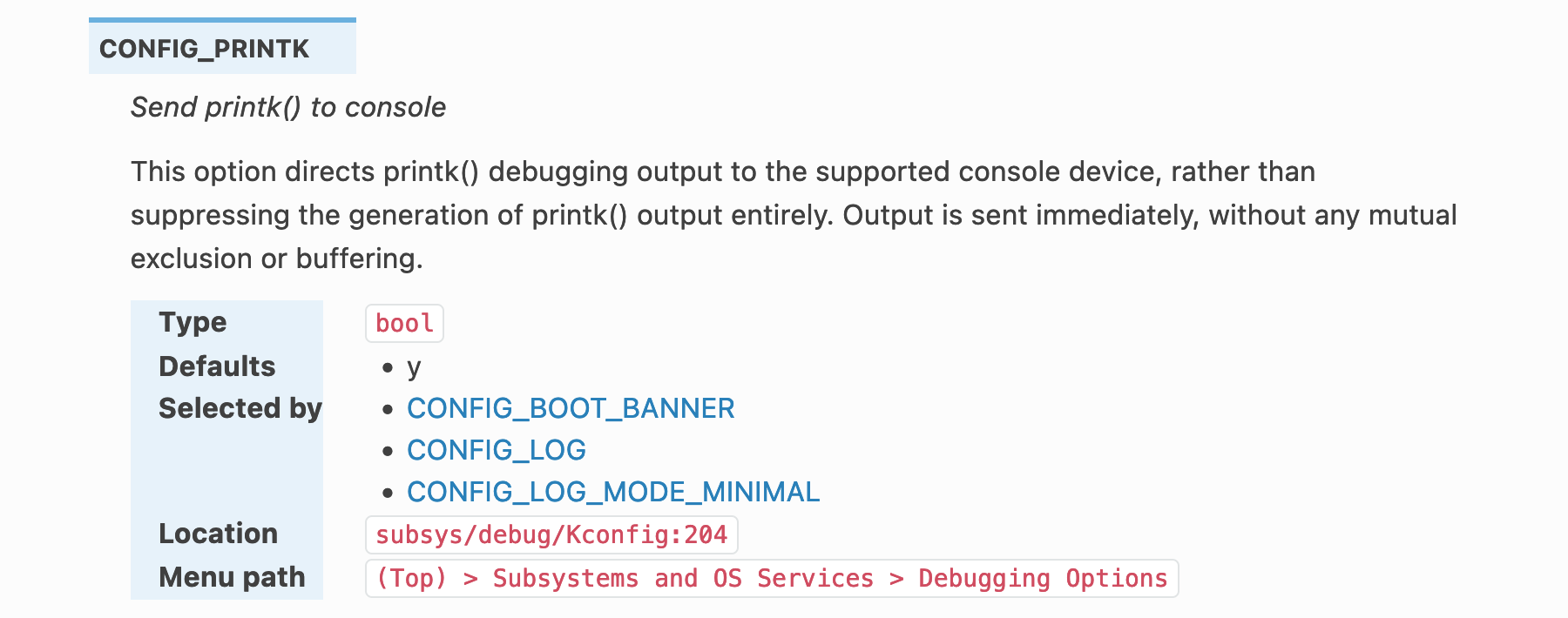 Let’s have a short look at our PRINTK symbol. A quick search for CONFIG_PRINTK in our local Zephyr code reveals how the symbol is used in the implementation of the printk debugging subsystem. Notice that the below snippets are simplified versions of the real code: