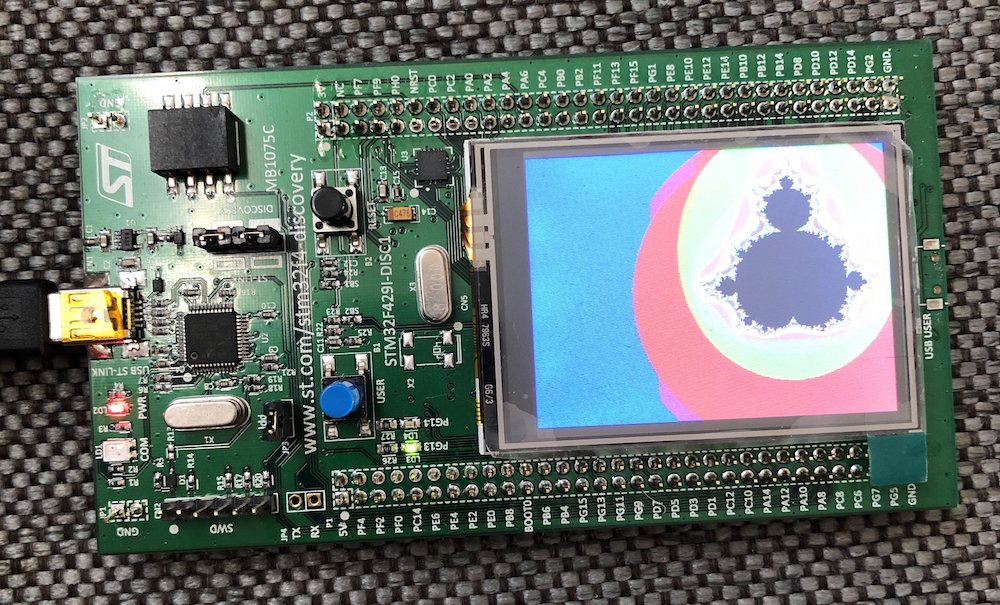 You should now be seeing the Mandelbrot fractal on the LCD of the Discovery board. Here it is!